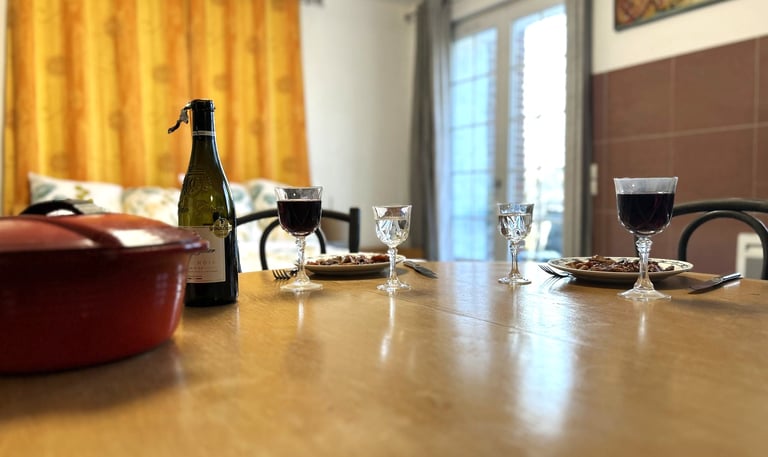 A proximité de notre logement, vous ne trouverez pas de restaurant. Ne vous inquiétez pas. Vous trouverez dans vos placards de quoi manger deux repas, les arrivées tardives seront sereines. Par ailleurs, nous vous proposons de vous restaurer. Notre cuisine est simple, la restauration n'est pas notre cœur de métier mais nous mettrons tout notre cœur à vous régaler. Si vous souhaitez que nous vous préparions à manger prévenez nous 48 heures à l'avance et tout vous attendra dans votre réfrigérateur prêt à être réchauffé et dégusté. Nous sommes autorisés à vous proposer de la bière et du vin (petite licence)
