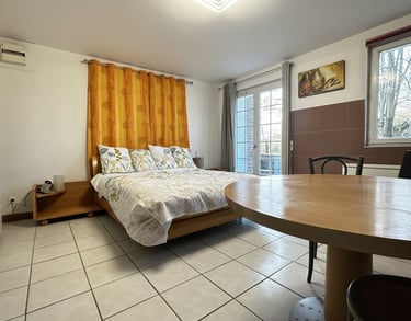 Lit 140 très confortable. Théière, cafetière, grille pain bouilloire. Vos repas vous attendent dans le frigidaire prêts à être réchauffés et dégustés. Boissons comprises. Le petit déjeuner continental sera dressé sur un plateau à votre disposition.
